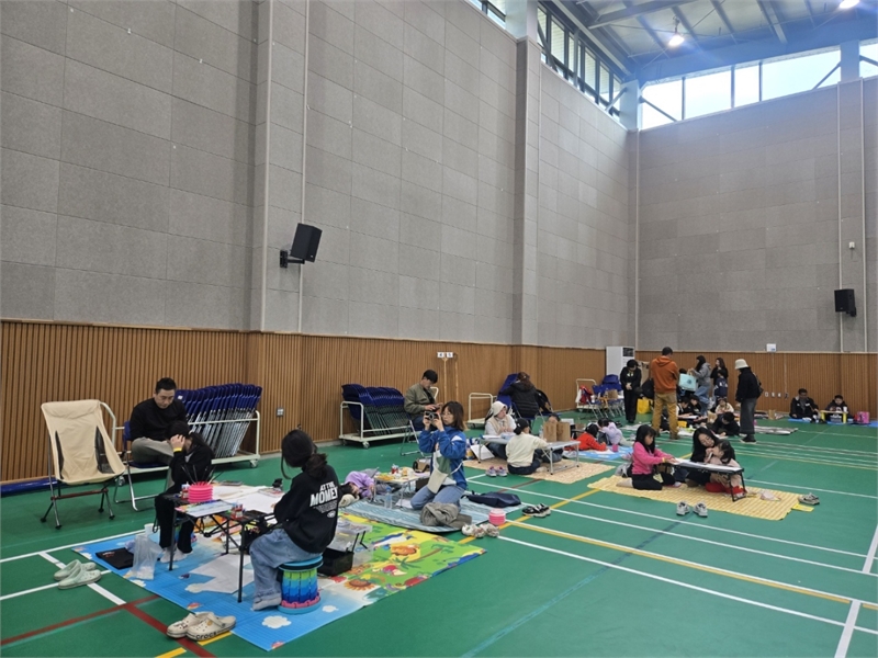 우천으로 실내체육관에서 진행된 초등학교 사생대회에서 학생들이 부모들과 함께 그림을 그리고 있다.
