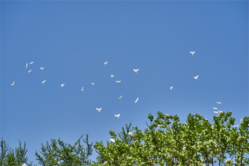 추모식 퍼포먼스로 진행된 '흰 풍선 날리기'에서 참석자들이 날린 비둘기 풍선들이 하늘 높이 날고 있다.