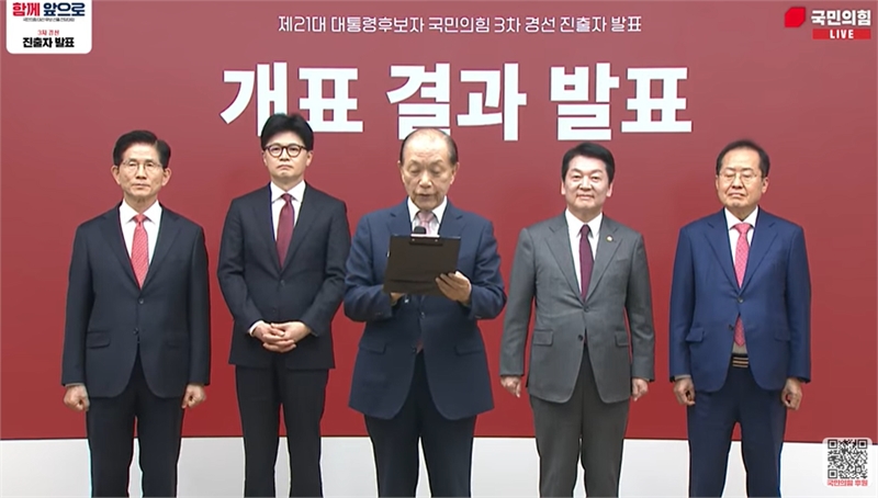 국민의힘 대선 2차 경선 황우여 선관위원장이 28일 오후 대선 후보 최종 경선 2명을 발표하기 직전 경과 보고를 하고 있다. 맨 오른쪽에 선 홍준표 후보가 눈을 지그시 감고 있다. 국민의힘TV