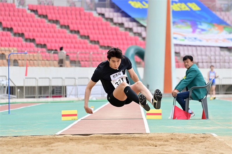 '조금만 더 멀리!'. 멀리뛰기 종목에 출전한 진주시 선수가 발구름판을 힘껏 디딘 뒤 도약해 모래판 위로 날고 있는 모습. 진주시