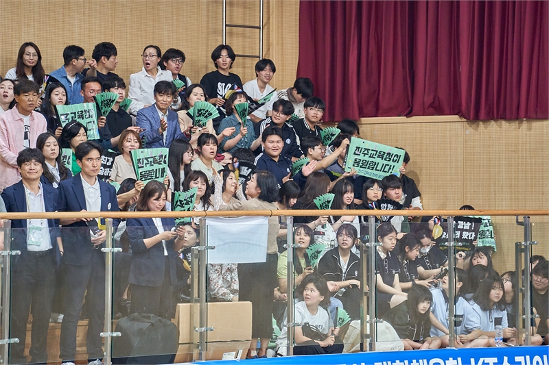 경남 진주교육지원청은 26일 제54회 전국소년체육대회(전국소년체전) 15세 이하 배구 4강 경기가 열린 경상국립대 진주 칠암캠퍼스 체육관에서 진주 동명중과 경해여중(옛 선명여중) 배구팀을 응원했다.