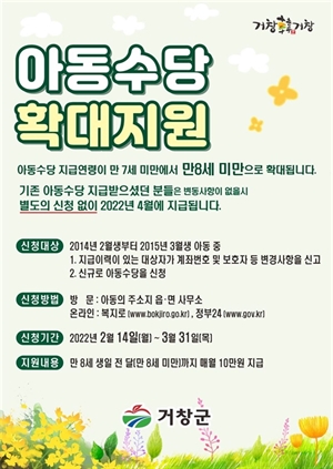 경남 거창군은 오는 4월부터 아동수당 지급 연령을 현행 만 7세 미만에서 만 8세 미만으로 확대해 지급한다고 밝혔다.