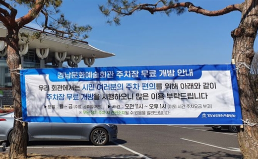 최근 진주시 천전초등학교 인근 지역이 '주정차금지구역'으로 지정돼 회관 인근 상가를 이용하는 시민들이 주차 불편을 겪고 있어 경남문화예술회관은 ‘평일 오전 11시~오후 1시’ 사이 주차장을 무료 개방한다.