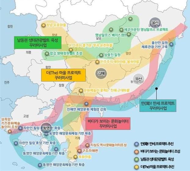 남동권(경남・부산・울산)은 해양문화체험 휴양지대 구축을 목표로 한다. 2,029억 원을 들여 ▲남동권의 만(灣)을 활용한 만만세 프로젝트 ▲바다가 보이는 문화놀이터 조성 ▲남동권 생태관광벨트 육성 ▲더(THE) 마을 프로젝트 등을 추진한다.