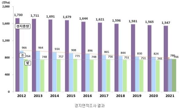한편 전체 경지면적은 154만 6717㏊로 전년보다 1.2% 감소했다. 경지면적 감소는 2013년 이후 9년째 계속되고 있다.