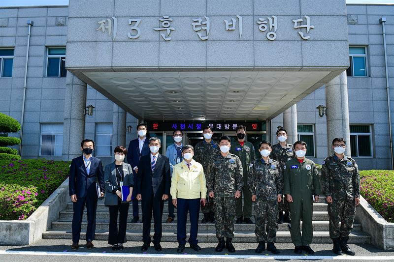 사천시 관계자가 공군 제3훈련비행단을 방문해 단체사진을 찍고 있다. 사천시 제공