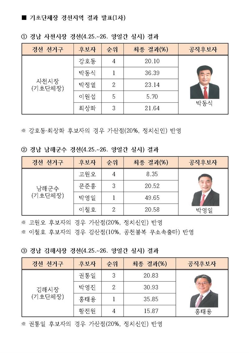 국민의힘 경남도당 공천관리위원회는 27일 4개 시군의 시장과 군수 최종후보자를 확정 발표했다. 다음은 경선 결과 내용이다. 6 0 더경남뉴스 정창현 기자 gaia008@naver.com 정창현 기자의 기사 더보기 저작권자 ⓒ 더경남뉴스