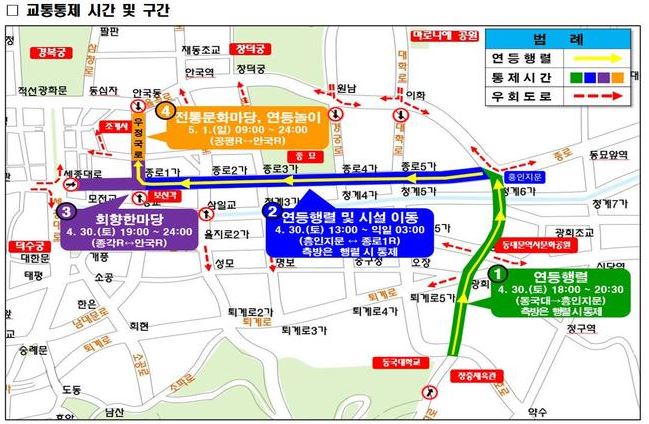 종로 종각~흥인지문 구간은 연등 행렬 사전 준비로 30일 오후 1시부터 다음날 새벽 3시까지 통제된다.