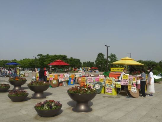 지난해 5월 거리두기가 한시적으로 풀리자 등장한 한강 여의도공원 돗자리 판매대. 더경남뉴스 DB