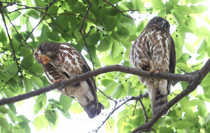 천연기념물인 솔부엉이 새끼 두마리가 19일 경남 함양군 함양군청 앞마당 느티나무에서 포착됐습니다.