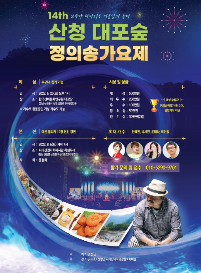 경남 산청군은 오는 8월 6일 오후 7시 산청군 삼장면에서 열리는 ‘제14회 산청 대포숲 정의송 가요제’의 참가 신청을 받고 있다.