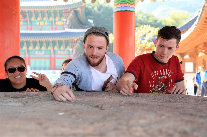동의보감촌 동의전 복석정에서 동전 세우기에 열중인 외국인들. 산청군 제공