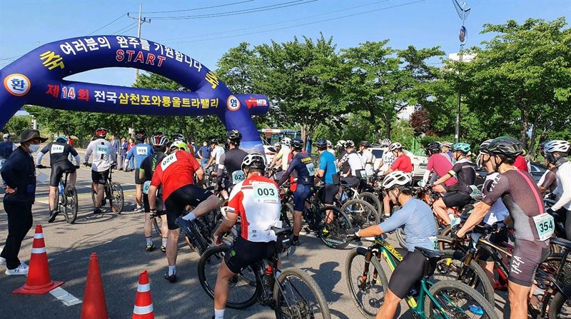 와룡울트라 전국산악자전거 참가자들이 출발하고 있다. 사천시 제공