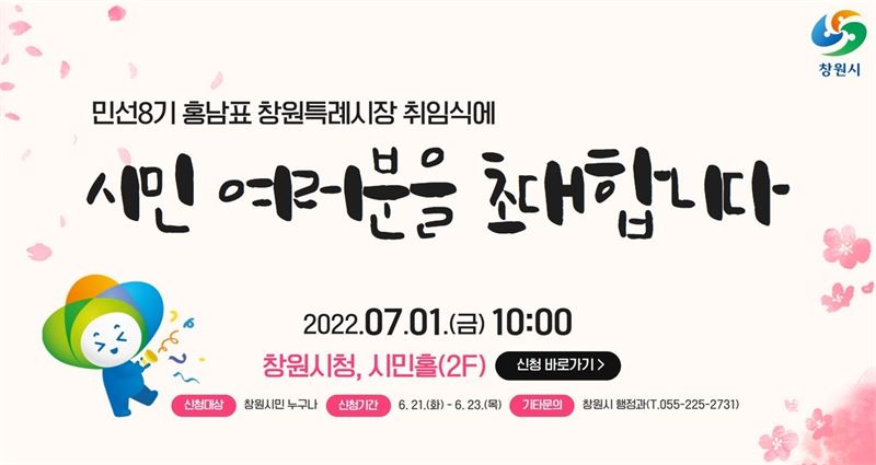 창원시장 취임식에 참여하고자 하는 시민은 23일까지 창원시 홈페이지 취임식 참여 희망 코너에 접속해 신청하면 된다.