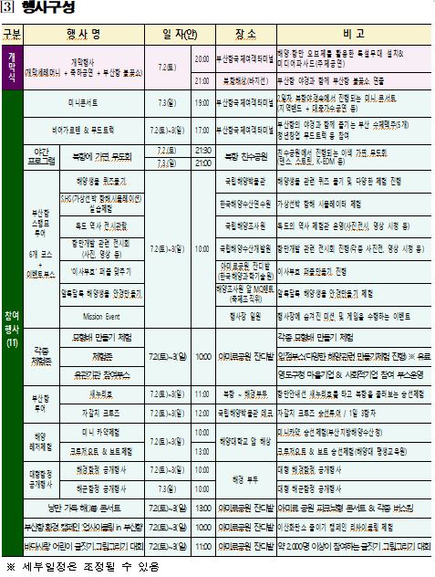 이 말고도 ▲부산항 환경 캠페인 ▲바다사랑 어린이 글짓기·그림그리기 대회 ▲각종 체험 부스도 운영된다.