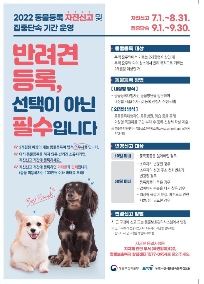 박대만 농축산과장은 “동물 등록을 해야 반려동물 유기 행위를 막고, 잃어버린 동물을 되찾을 수 있다”며 “반려동물 등록비 지원 사업도 추진 중이니 반려동물 소유자들은 이 사업을 활용해 등록비 부담을 낮추고 동물 보호에도 동참해주시길 바란다”고 당부했다.