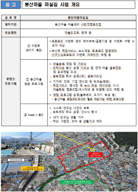 이번 선정된 영도구 ‘봉산마을 마실길’은 서민의 삶의 정취가 남아 있지만, 최근 빈집 증가 등으로 사람들의 발길이 뜸한 곳이다. 이런 봉산마을을 살리고자 하는 로컬 크리에이터들이 국토부의 도시재생 프로그램 ‘빈집줄게 살러올래**’를 통해 마을에 정착했으며, 주민들과 함께 봉산마을센터, 블루베리농장, 게스트하우스 등의 골목 거점 시설과 골목길을 활용한 마을리조트를 지향하는 활동을 펼치고 있다.