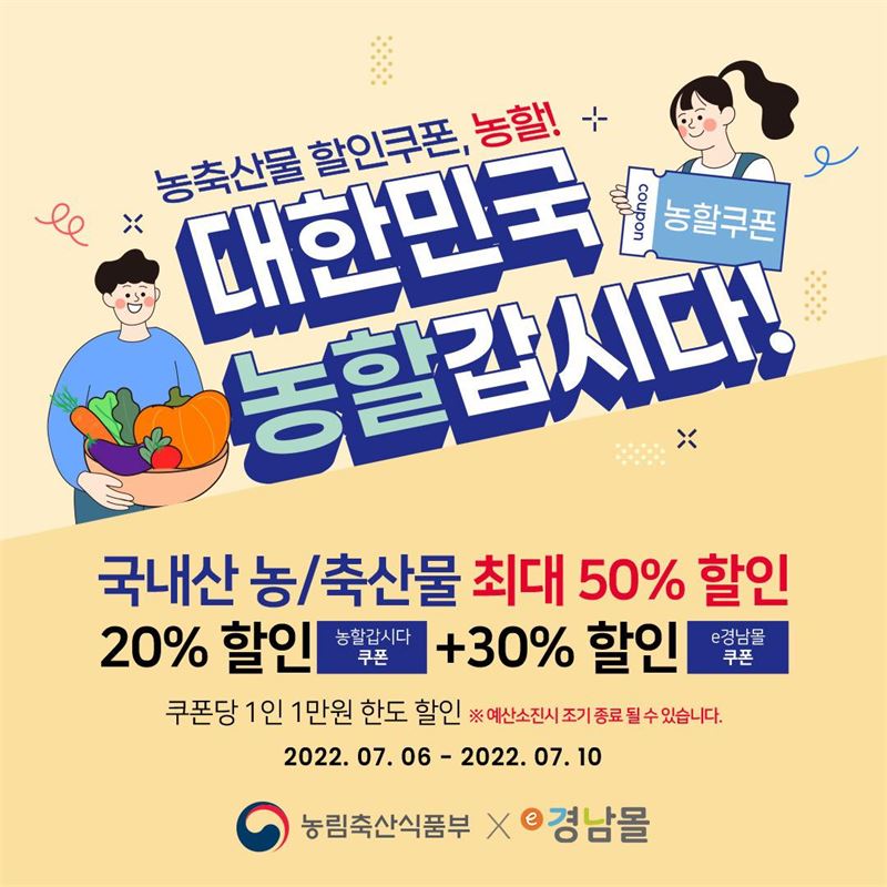 경남도는 7월부터 e경남몰에서 농축산물 구매 시 할인받을 수 있는 ‘농할쿠폰’ 지원 행사를 한다고 밝혔다.