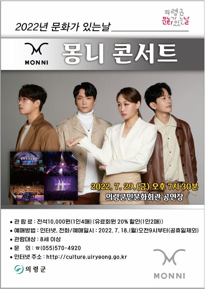 경남 의령군은 ‘7월 문화가 있는 날’을 맞아 오는 29일 저녁 7시30분 파워풀 한 밴드 사운드의 매력을 감상할 수 있는 '몽니 콘서트'를 의령군민문화회관 무대에 올린다.