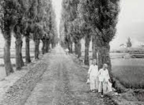 미루나무가 줄지어 선 신작로. 두루마기에 갓을 쓴 어르신들이 잔칫집 가는 풍경으로 보인다.