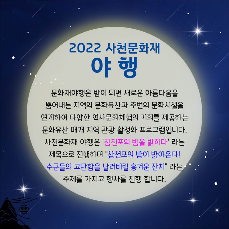 사천시가 주최하고 문화재청, 경남도가 후원하는 사천문화재 야행은 아름다운 야경을 감상하며 사천지역의 문화를 학습하고 체험할 수 있는 프로그램이다.