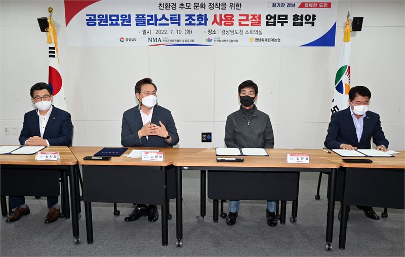 경남도는 19일 도청 소회의실에서 (사)전국공원묘원협회 부울경지회, (사)한국화훼자조금협의회, 영남화훼원예농협과 친환경 추모 문화 정착을 위한 ‘공원묘원 플라스틱 조화 사용 근절’ 업무 협약을 했다.