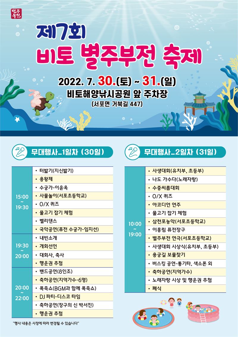 별주부전의 고장인 서포면 비토섬에서 열리는 이번 축제는 비토섬을 찾은 관광객들에게 깨끗하고 아름다운 비경을 알리고 별주부전 설화의 무대가 된 곳임을 홍보하기 위한 축제다.