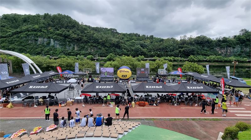 경남문화예술회관 야외공연장 특설 농구코트에서 열리고 있는 ‘2022 AABxKXO 3x3’ 농구 대회. 뒤쪽이 '진주 8경'의 하나라는 남강 건너 뒤벼리다. 진주시 제공