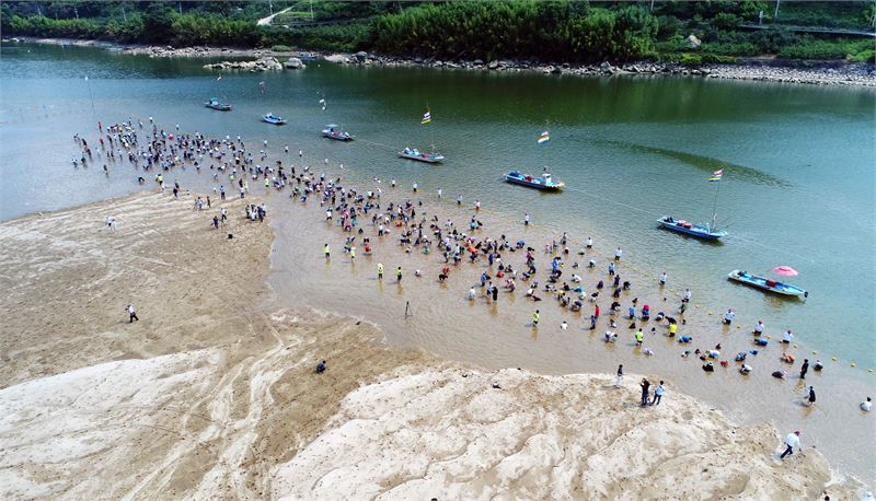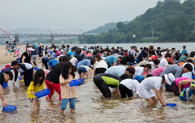 강바닥에 숨겨놓은 황금재첩을 찾기 위해 강으로 뛰어가는 축제 참가자들