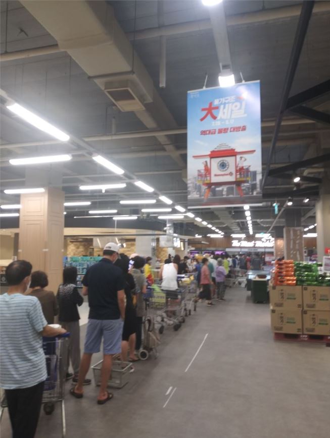 말복인 15일 홈플러스 매장에서 '당당치킨'을 사기 위해 길게 줄을 서 있다. 이날 복날을 맞아 평상시 가격인 6990원에서 1000원 싼 가격에 판매했다. 정기홍 기자