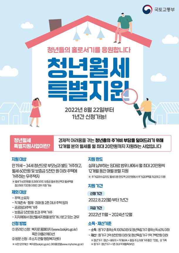 다만 보다 많은 청년들이 혜택을 받을 수 있도록 지자체의 기존 월세지원사업, 공공임대주택 입주로 혜택을 받은 경우 이번 지원 대상에서 제외되며, 주거급여를 받고 있는 경우 20만원 한도 내에서 차액을 지원 받을 수 있다.