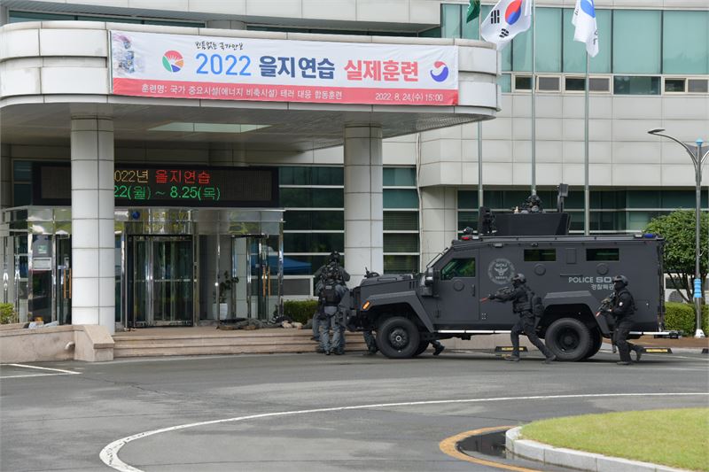 경남도 2022 을지연습 훈련에서 경찰특공대가 테러 진압을 위해 건물로 진입하고 있다.