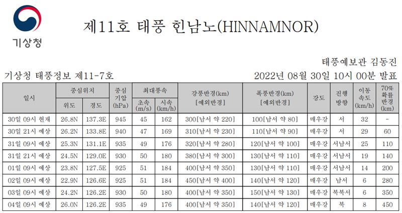 위의 표에서 보듯이 힌남노는 30도를 웃도는 고수온 해역을 지나면서 30일 오전 9시 현재 중심기압 945hPa(헥토파스칼), 최대풍속 초속 45m로 매우 강해져 있다. 이 정도는 강풍 반경 300㎞로 태풍의 직접 영향권에서는 사람과 큰 돌이 날아갈 정도다.
