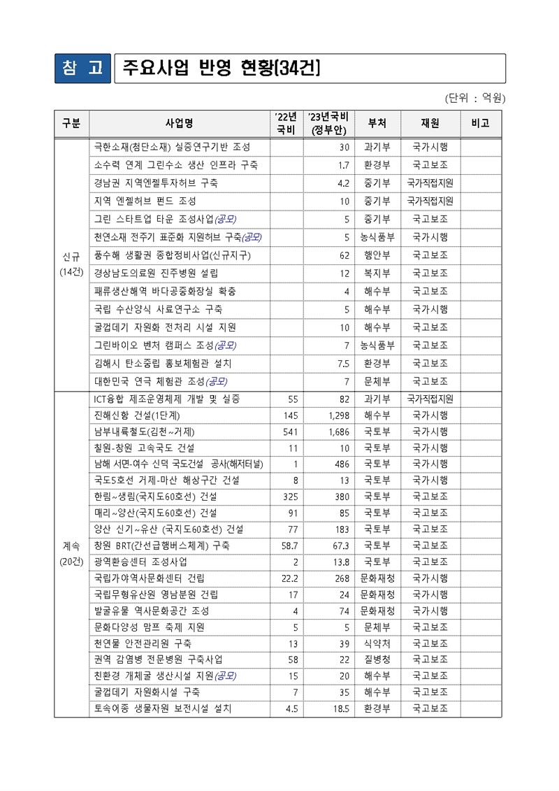 이번에 반영된 내년도 정부예산안은 국가시행사업을 포함해 지난해 최종 확보액 8조 173억원보다 3.3% 증가했고 주요사업으로 진해신항, 남부내륙철도 등 국가시행사업은 4.6% 증가했다. 국고보조금 기준으로는 지난해 7조 425억 원보다 3.1% 증가한 7조 2581억 원이 반영됐다.