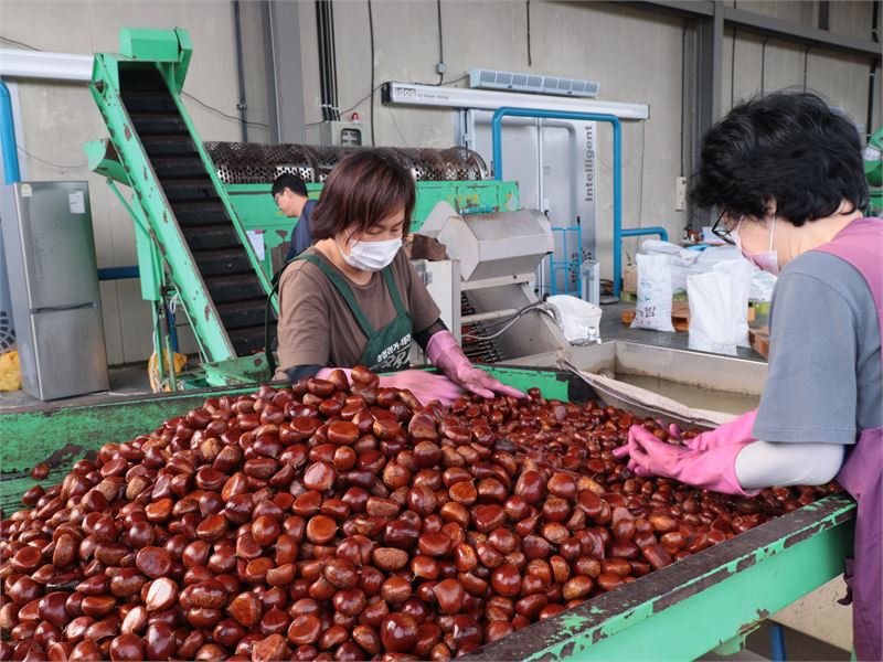 산청 농협에서 산청산 햇밤을 공동선별 하고 있다.