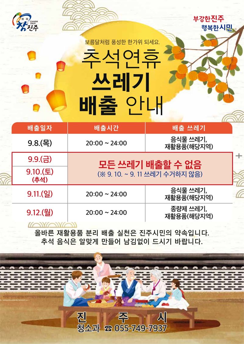진주시 관계자는 “연휴기간 중 추석 당일인 10일, 추석 뒷날인 11일은 모든 쓰레기를 수거하지 않기 때문에 배출일을 꼭 지켜 줄 것을 당부드린다”고 말했다.