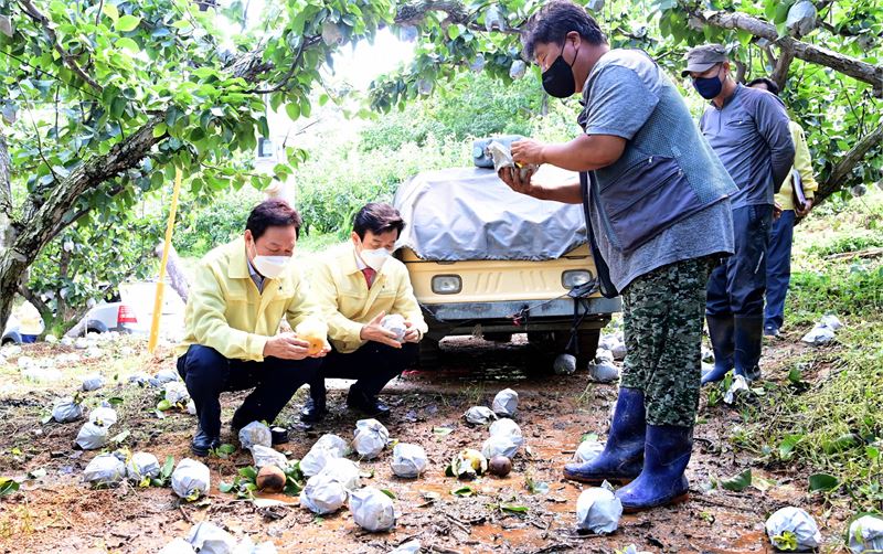 박완수 경남도지사는 6일 오전 제11호 태풍 ‘힌남노’로 피해를 입은 진주시 문산읍 배 과수농가를 방문해 피해 현장을 둘러보며 신속한 응급복구를 약속했다.