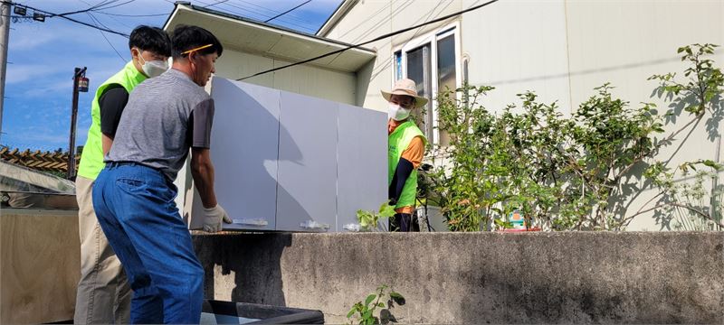 독거 어르신댁으로 세탁기를 옮기고 있다.