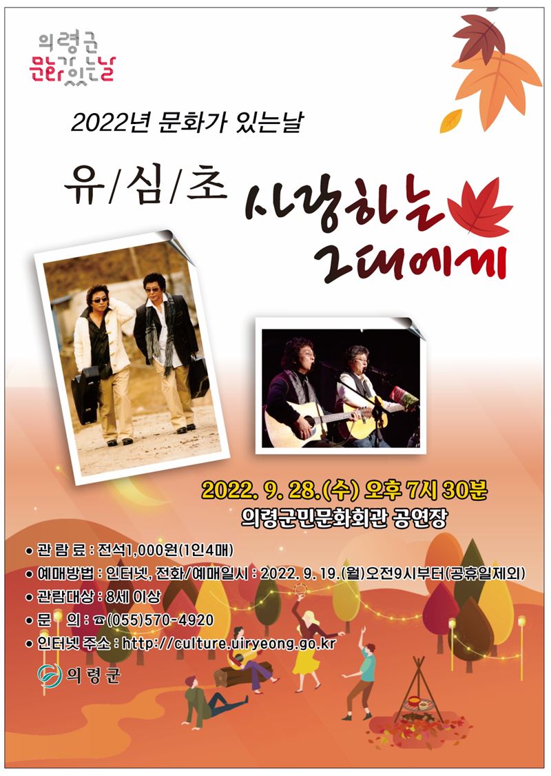 경남 의령군은 ‘9월 문화가 있는 날’을 맞아 오는 28일 오후 7시 30분 가을밤 잔잔한 통기타의 매력을 느낄 수 있는 '유심초 사랑하는 그대에게' 공연을 의령군민문화회관 무대에 올린다.