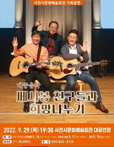 경남 사천문화재단이 오는 29일 저녁 7시 30분 사천시문화예술회관 대공연장에서 기획공연으로 대중음악 ‘쎄시봉 친구들과 희망나누기’ 공연을 연다.