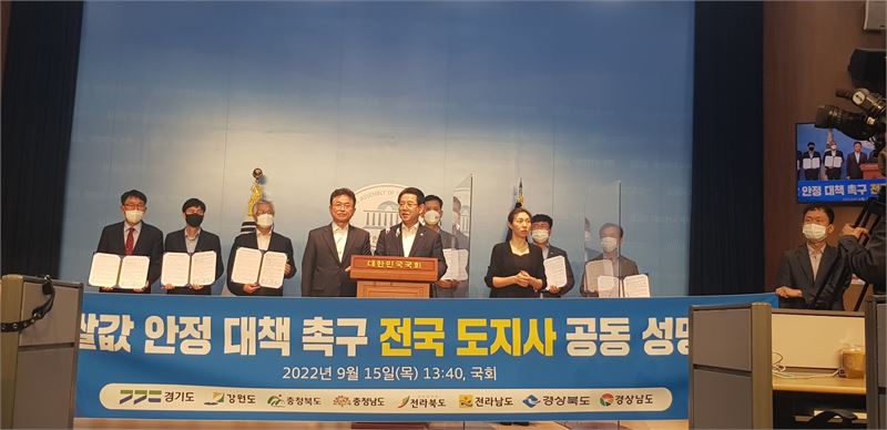 경남도 등 쌀 주산지 8개 도의 도지사들이 천정부지의 고물가 행진에도 불구하고 쌀값이 지속 폭락하자 15일 오후 국회 정론관에서 쌀값 안정대책을 촉구하는 성명서를 발표했다.