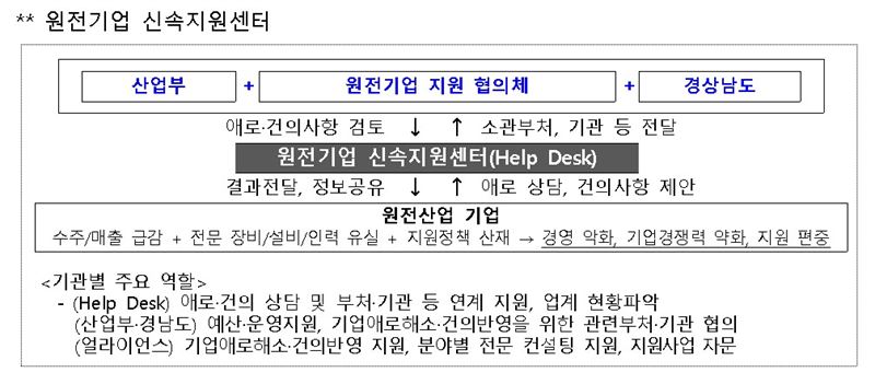 이어 원전산업 현장에서 정부와 기관, 기업이 일원화 된 소통채널을 구축하고자 ‘원전기업 신속지원센터’를 개소해 현판식을 가졌다. 센터는 협의체의 파견 인력으로 운영하고 향후 경험많은 퇴직 전문가를 채용해 지원체계를 더욱 강화해 나갈 계획이다. 국비 10억 원을 포함해 25억 원의 사업비가 5년간 투입된다.