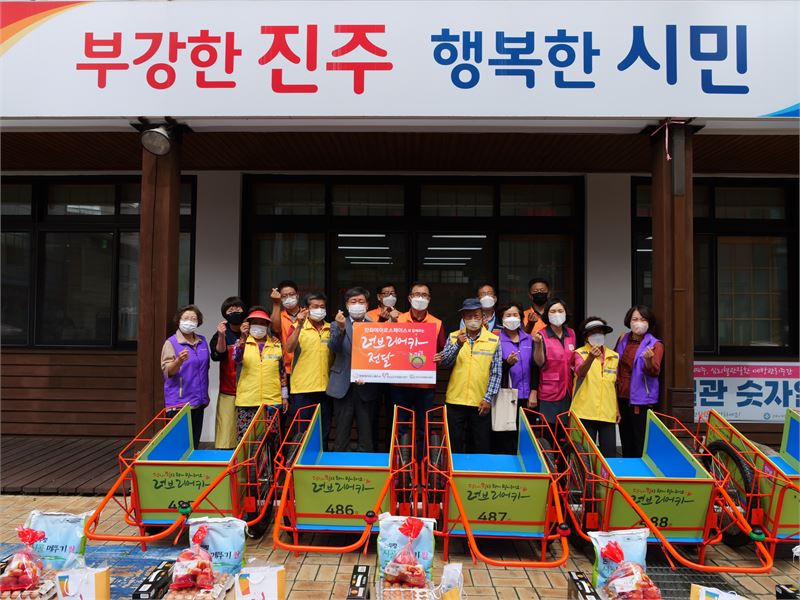 경남 진주시자원봉사센터는 19일 성북동 행정복지센터에서 경남도자원봉사센터, 한화에어로스페이스, 여성리더봉사단 등 20여 명이 참석한 가운데 폐지를 주워 생계를 유지하는 어르신들을 위한 ‘사랑의 리어카’ 전달식을 가졌다.