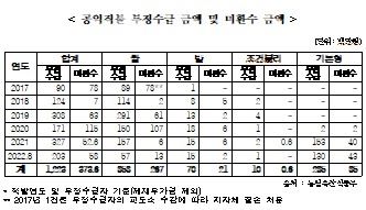 농업직불금은 2020년 5월 공익형직불금제로 개편됐는데 개편된 해인 2020년에 56건이었던 부정수급 건수는 지난해 3배나 급증한 168건, 3억 2700만원에 달했으며 미환수 금액은 5260만원이었다.
