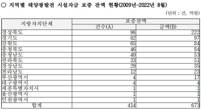 8월말 현재 ‘태양광발전 시설자금 보증’ 잔액은 총 414건에 673억원이며, 가장 많은 보증 잔액이 있는 지자체는 경북(96건, 222억원)이었다.