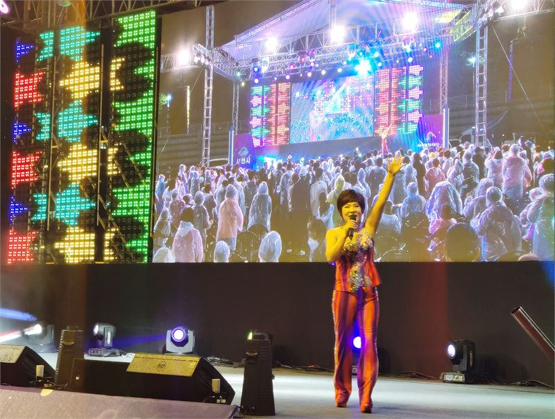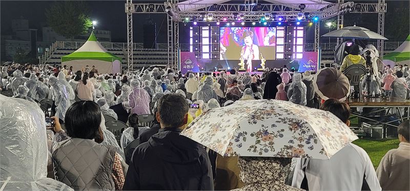 가랑비가 내리는 가운데서 시민들이 김연자의 열창을 즐기고 있다.