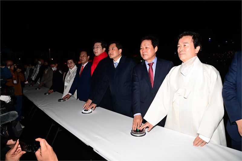 진주시 망경동 특설무대에서 있은 초혼점등식. 조규일(오른쪽부터) 진주시장, 박완수 경남도지사, 진주시 지역구인 박대출·강민국 국회의원 등이 축제의 시작을 알리는 초혼점등식 버튼을 누르고 있다.