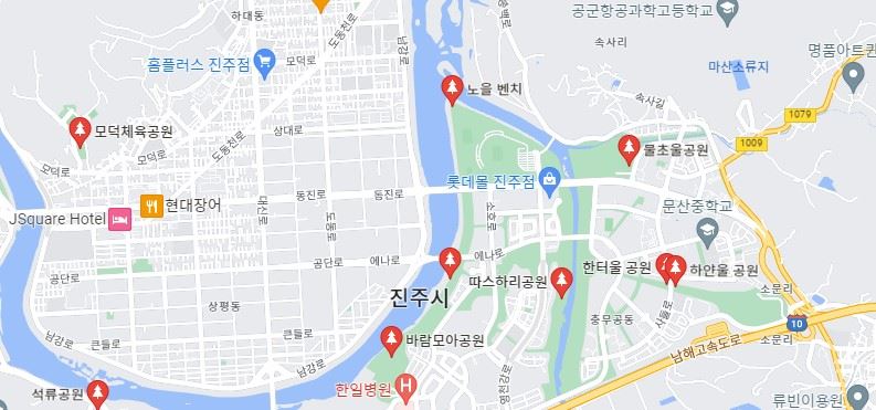 제2호 미세먼지 차단 숲이 조성된 바람모아공원~노을지공원~종합경기장 위치도. 종합경기장은 노을벤치 오른쪽에 있다. 구글 맵 캡처