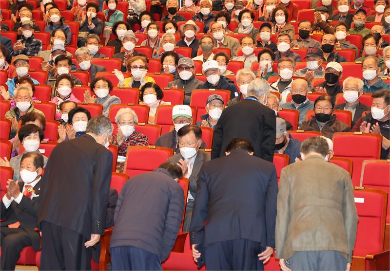 함양군수 등 노인의 날 행사 참석자들이 어르신들에게 인사를 하고 있다.