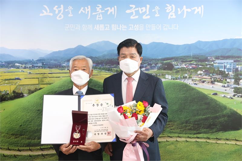 6·25전쟁에서 사망한 박희호 상병의 화랑무공훈장을 받은 조카 박일규(왼쪽) 씨와 이를 전수한 이상근 군수. 고성군 제공
